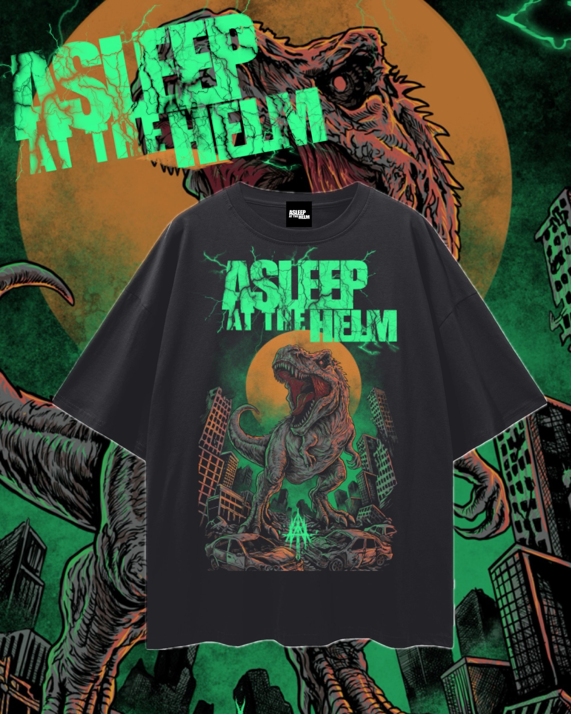 Dino loose in an apocalyptic modern earth plugging your favourite band… why wouldn’t you wanna wear this?